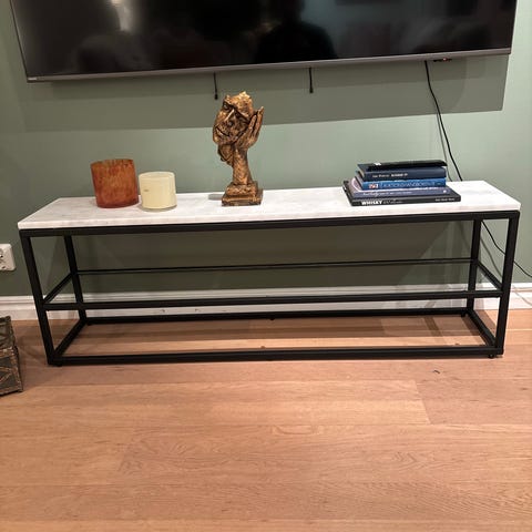 Säljer matchande och stilren tv-bänk, soffbord och sidobord i vit marmor glas med stålram för paketpris 1500kr. Borden / TV-bänken är stabila och i mycket fint skick.