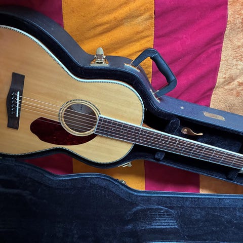 Skicket är, bortsett från mindre skavmärken på baksidan (förmodligen från skjortknappar) och ett litet rött streck (också baksidan) mycket bra. Inte mycket spelad på. Originalsträngarna sitter på och de är OK. Levereras med ett helt nytt Soundsation case.