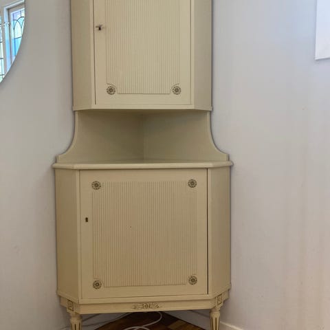 Jättefin vit hörnhylla med skåp.