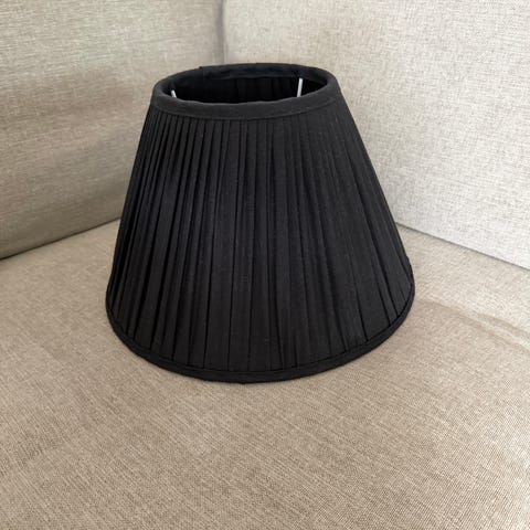 En svart lampskärm 20 cm hög, 18 cm upptill och 24 cm nertill bred.