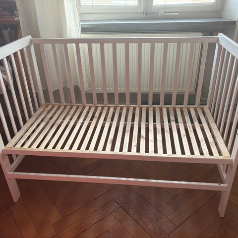 IKEA wooden crib 60x120 cm, used but in very good condition. Stable and well cared for. Dismantled and ready for easy transport. Mattress included for free with purchase. Ready for pickup.