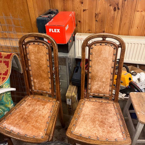 Gamla stolar i ek med skin sits