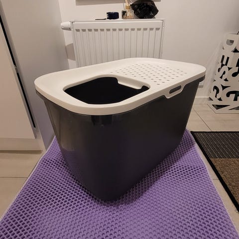 Kattlåda med tillhörande spade. Produkten är tillverkad i plast och har en grå och svart färg. Passar för användning som kattlåda.