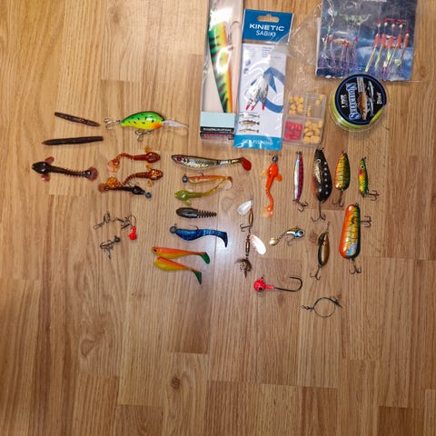 Säljer ett paket med 25 st nya gäddbeten från Storm. Ingår också deras lösning med längre skruv och blandade vikter. Några beten har varit riggade men de flesta helt nya. Första bilden är på alla beten och den andra på de 4 olika beten som ingår i paketet (T-bone shad 18 och 23 cm samt Boom shad 19 och 24 cm). Nypris ca 2400 kr