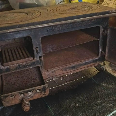 Vitlackerad. Front med ugn och spisknappa. Tre plattor. Tre kastruller och en bakplåt medföljer. Längd 30 cm. Bredd 23 cm. Höjd 23 cm. 220v.