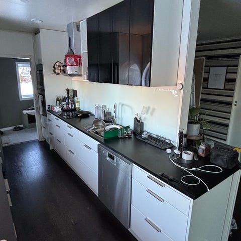 Komplett kök exkl kyl och frys, Utrustat med inbyggd ugn, spis, fläkt och diskho. Köksskåp med både lådor och skåp för förvaring. Passar för installation i hörnrum enligt medföljande ritning. Luckor + stommar inkl bänkskiva blandare och diskho 6500:-