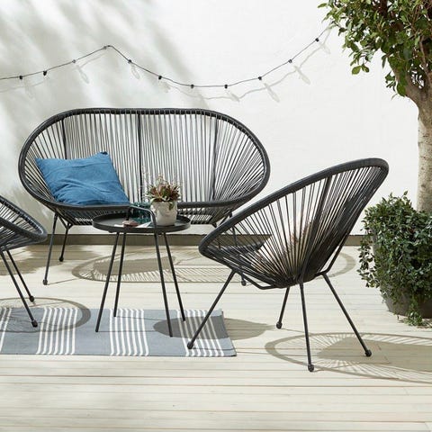 Balkongmöbler i rotting. Liten nätt balkongsoffa. Bredd 130 cm. Höjd med ryggstöd 80 cm. Lite blekt i färgen men charmig. Pris 700 kr.