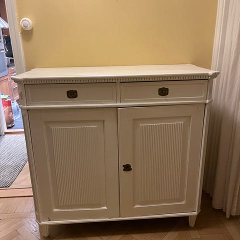 Byrå/Skänk: Vit byrå med två rymliga lådor och fina beslag. Pris: 800 kr