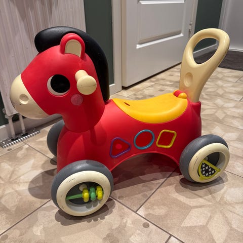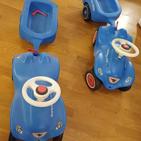 BRIO Big Bobby Car barnleksak i röd färg. Tillverkad i plast med fyra hjul och ratt. Designad för små barn att sitta på och köra genom att sparka med fötterna. Utrustad med handtag för att kunna dras eller styras av vuxen.