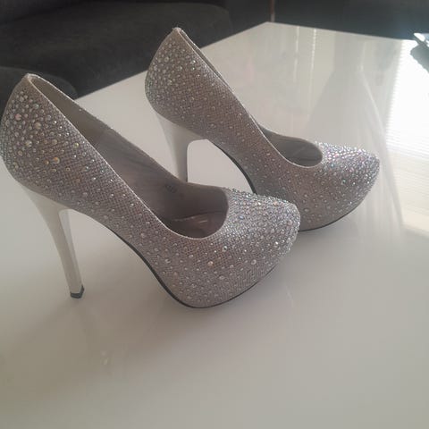Ingen märke klackskor i storlek 37 med silverglittrigt material. Skorna har hög klack och rundad tå, lämpliga för formella tillfällen.