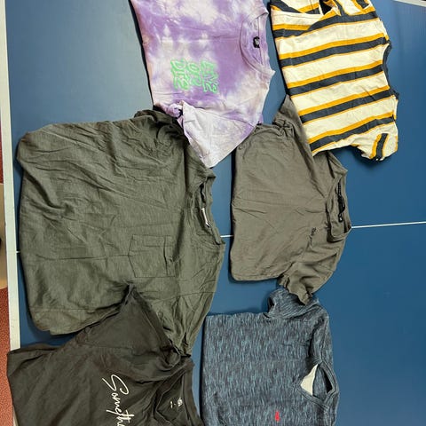 Plaggen är i fint skick, men det finns ett litet hål under ärmen på den gråa t-shirten