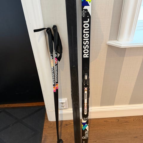 Rossignol längdskidor med tillhörande pjäxor och stavar, passar 8-10år. Använt men fint skick. Skidorna är vallningsfria (ej skins, men räfflad fästzon). Pjäxor storlek 34.