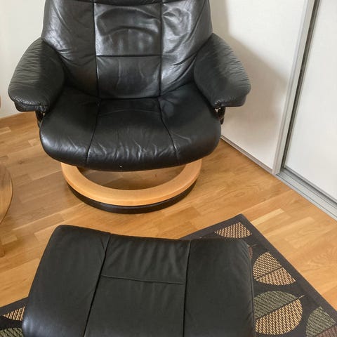 Fåtölj i svart skinn med fotpall. En medium och en large (bredare).