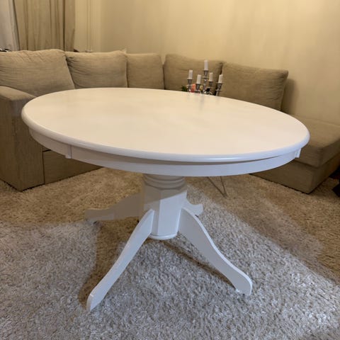 Matbord med iläggsskiva och sex stolar