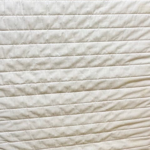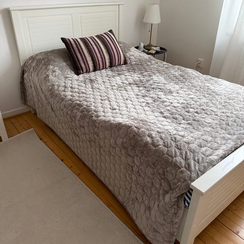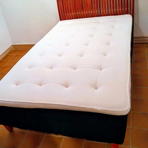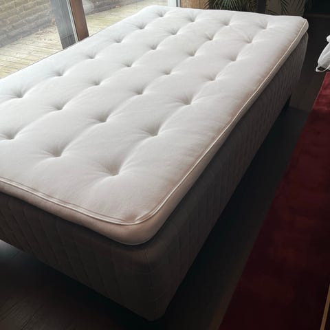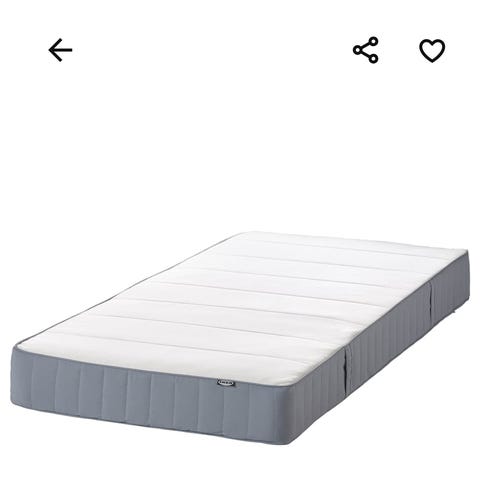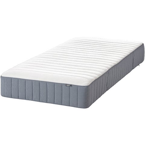 IKEA madrass med vit överdrag och beige sidor. Passar för användning som sovmadrass och är tillverkad med material avsedda för komfort och stöd.
