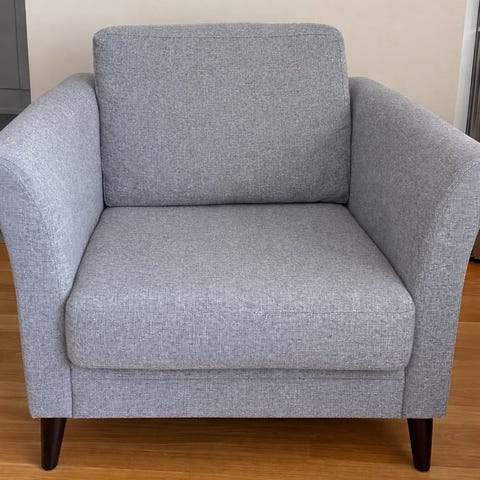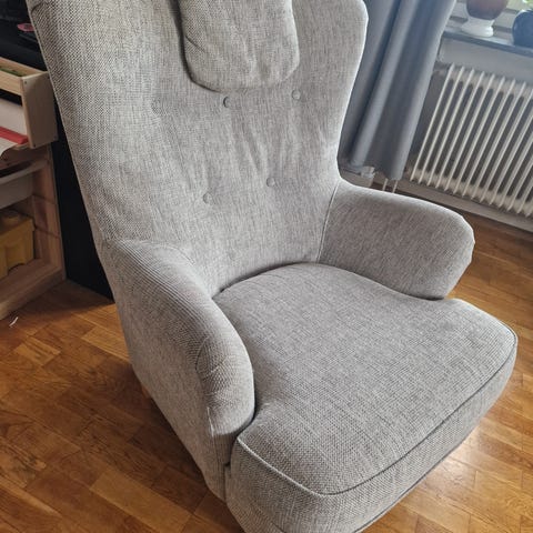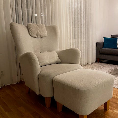 Fin brun fåtölj med fotpall. Sparsamt använd.
