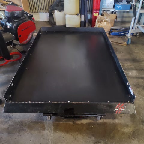 Släde för transport med metallram och plattform, anpassad för dragning i snö. Konstruktionen är robust med metallskidor och en öppen lastyta. Passar för att frakta gods eller utrustning över snöiga underlag.