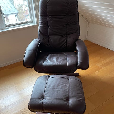Säljer en mycket bekväm och robust fåtölj i mörkbrunt skinnklädsel. Den är snurrbar, justerbar med tilltfunktion. Perfekt för läshörnan eller framför TV:n. Säljs p.g.a. flytt. Hämtas I Högsbo.