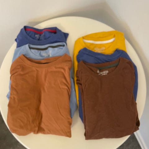 Enfärgade i grönt, blå, ljus turkos och gul. Alla förutom den gula är släta med pelle p märkning och den gula har tryckt text/motiv på bröstet.