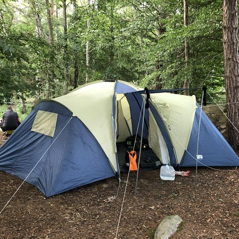 Stort hustält med två innertält. Inget mögel. Komplett. En dragkedja fungerar sämre. Klassisk äldre typ. Hämtas.
