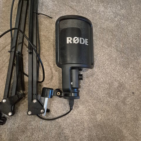 Røde NT1 5th generation kondensatormikrofon med tillbehör inklusive shock mount, pop filter och kablar. Mikrofonen är svart och används för inspelning av ljud i studiomiljöer.