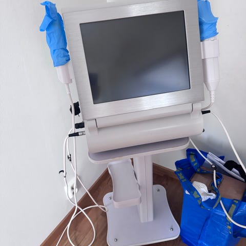 Salon Ambience hårtork med huva i grå färg. Utrustad med flera kontrollknappar för inställning av värme och fläkthastighet. Justerbar höjd och stabilt stativ. Används för torkning och behandling av hår i salongsmiljö.