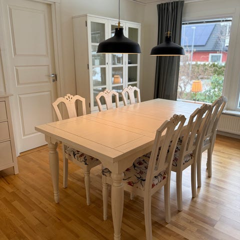 Vackert matbord med 6 stolar och tillhörande vitrinskåp
