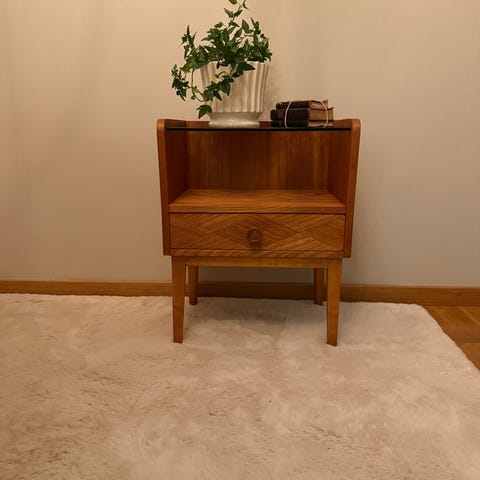 1 retro nattduksbord i teak med svartlackade ben från ca 1950-talet. Fint skick för sin ålder, 2 små flisor har gått från den utdragbara lådan. Ca 45*30 cm, höjd ca 55 cm. Finns i Sätila, Marks Kommun men kan levereras till Göteborg, Stockholm, Malmö med omnejd mot ersättning.