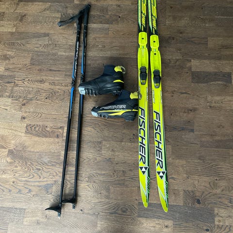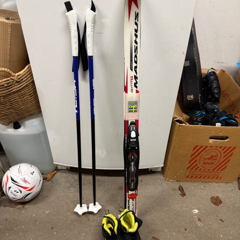 Madshus längdskidor med tillhörande stavar och pjäxor, bra nybörjarpaket för barn, klassisk åkning.