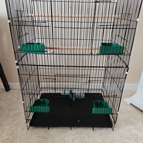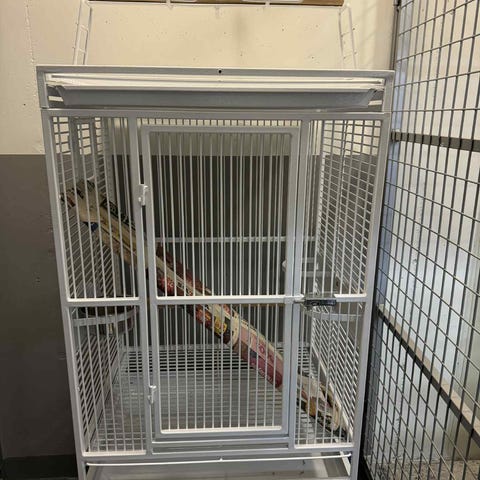 Fågelbur i vitt med ram i trä och galler i metall. Burens design inkluderar en stor dörr och en utdragbar bottenplåt för enkel rengöring. Passar för små till medelstora fåglar. Medföljer sittpinnar och matskålar