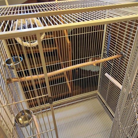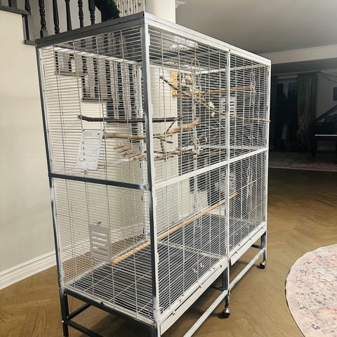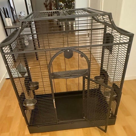 Säljer en rymlig och stabil fågelbur i vit färg, perfekt för större fåglar som t.ex. papegoja, grå jako, amazon eller mindre arter som vill ha gott om plats.