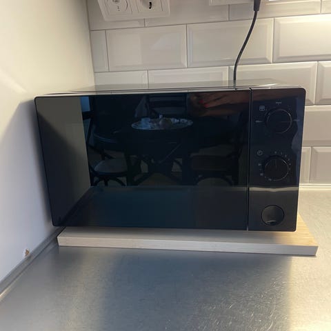 IKEA mikrovågsugn i vit färg. Utrustad med två vred för inställning av tid och effekt. Dörr med glasfönster och inre roterande tallrik för jämn uppvärmning. Passar för grundläggande uppvärmning och matlagning.