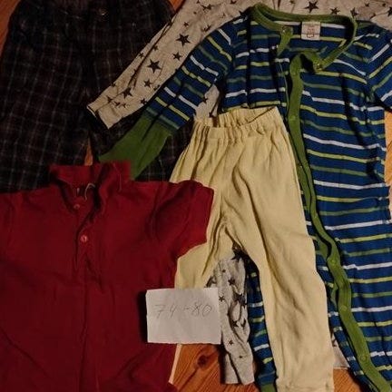 3 st stora påsar med olika sorts barnkläder i storlekarna 70-80. Massor av bodys, byxor, T-shirts, tröjor och pyjamasar mm. 150 kr per påse eller 300 för alla tre. Vill man handplocka gäller 30 kr per plagg.