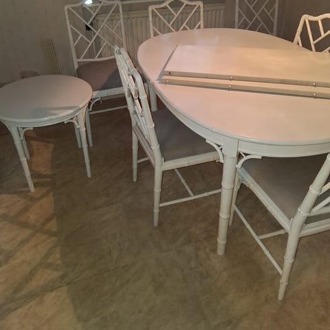 Massivt brunt träbord i mycket bra skick med tillhörande stolar med tygklädsel. Inga fläckar. Sparsamt använda. Skiva för att förlänga bordet ytterligare finns.