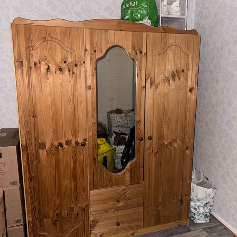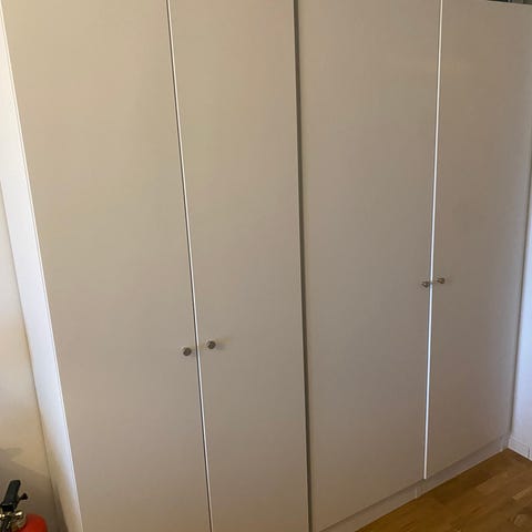 Säljer en större garderob med skjutdörrar i glas Höjd:200cm Längd:200cm Bred:60cm med 2 lådor,2 hyllor och 2 stänger (man kan köpa till fler lådor eller byxhängare på Ikea om man vill) finns 2 mindre skador i taket se sista bilden syns inte när det hänger kläder där.