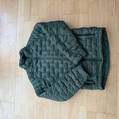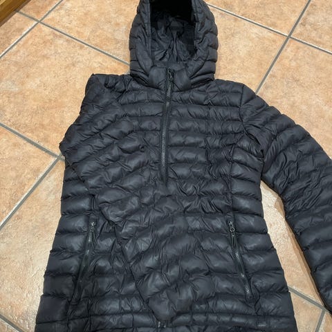 Det finns nån svag fläck bak. Runt ärmsluten är det lite mörkare på undersidan.