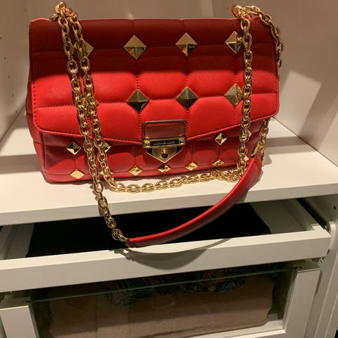 Guess läderväska för kvinna i röd färg. Väskan har ett quiltat mönster och detaljer i metall. Den har en dragkedja och flera fack inuti för förvaring.