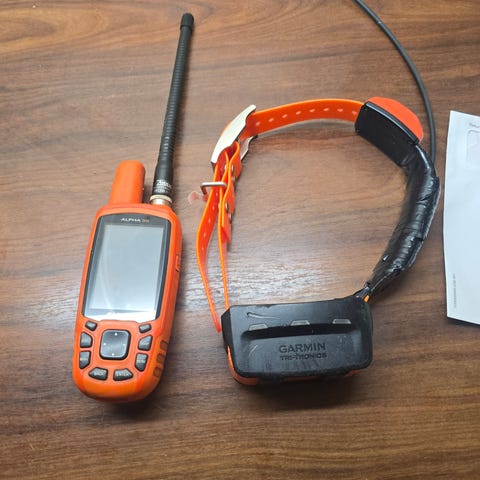 Garmin Alpha 100 + T5 halsband. Enheten används för spårning och navigering, lämplig för utomhusaktiviteter och hundträning.