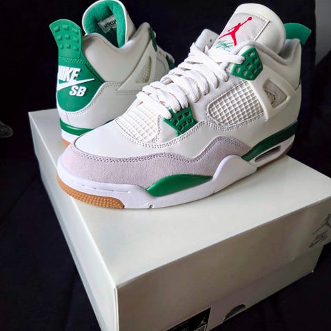 Air Jordan Sneakers i storlek 43. Skorna har en beige färg med gröna skosnören och detaljer i orange. Materialet verkar vara en kombination av mocka och textil. Modellen är avsedd för vardagligt bruk och har en klassisk design.