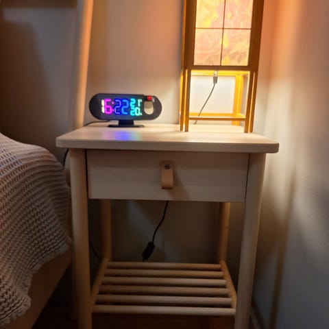 Snyggt och praktiskt sängbord i varm mellanbrun träfinish. Har tre smidigt utdragbara lådor med eleganta handtag, vilket ger gott om förvaring för böcker, laddare och sängtillbehör. Solid, modern design som passar moderna och neutrala inredningar.