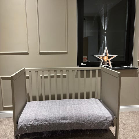 En spjälsäng där sängbotten kan ändras i djup från bäbis till äldre barn. Fint skick trots att den sövt flera barn i 2 generationer.