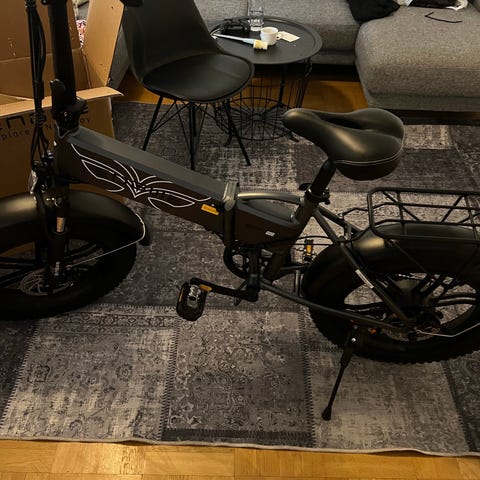 Ridge elcykel i svart färg med skivbromsar, batteri monterat på ramen och digital display på styret. Cykeln har kraftiga däck och är utrustad med fotstöd. Passar för vuxna användare. Pris går att diskuteras