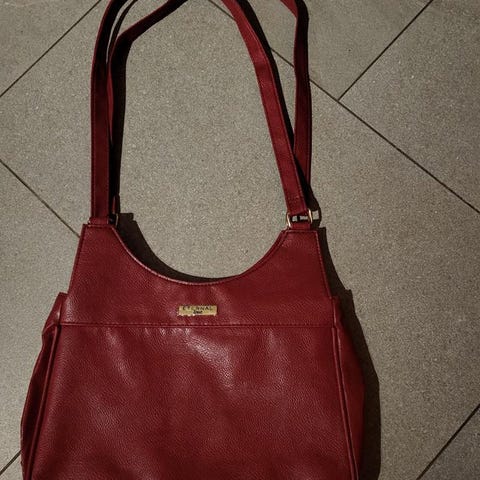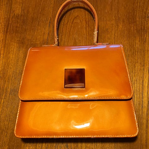 H&M väska från 1974. Tillverkad i lack med sidenfoder. Kedja saknas. Väskan har ett unikt tryck med olika tidningsomslag och ett magnetlås för stängning.