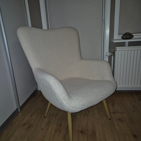 Fåtöljen poäng från IKEA, i björkfaner med beiget tyg. I fint skick. Nypris 1695:-.