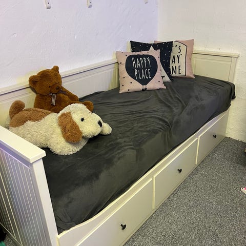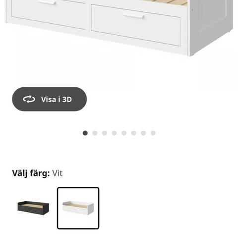 IKEA dagbäddar med tre lådor för förvaring. Produkten är vit och tillverkad i trämaterial. Passar för användning som säng eller sittplats i hemmet.