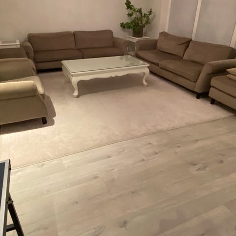 Fin ljusbeige färg. Tvättbara överdrag. Har tvättat alla soffkuddar inför försäljning.