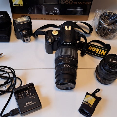 Nikon D 60 digital systemkamera med ett 18-55mm objektiv. Kameran är utrustad med ett vridbart pop-up blixt och levereras med batteriladdare och tillhörande kablar. Objektivet har en brännvidd på 18-55mm och en bländare på f/3.5-5.6. Minneskort och nytt batterie.