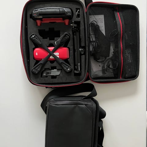 DJI Spark Mini-drönare i vit färg. Inkluderar skydd för propellrar, extra propellrar, laddare, två batterier, fjärrkontroll, originalbox och förvaringsväska. Drönaren är kompakt och lämplig för fotografering och videoinspelning från luften. Använd max 3 gånger och säljs pga att den inte används.
