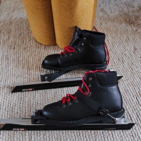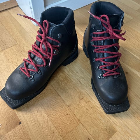 Alico pjäxor svart läder, med långfärdsskridskor storlek 42. Stövlarna har röda snören och är avsedda för vuxna. Modellen är robust och lämpar sig för utomhusbruk.nästan som ny