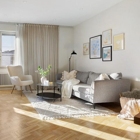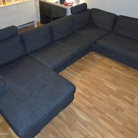 Soffa i Howardmodell med mässigfötter fram, golvskydd till hjulen medföljer (se bild). Inköpt 2023 i begagnat skick. Sparsamt använd av oss. Övre kant på ryggdynorna är lite missfärgade, jag har försökt fånga det på bild men i och med att det är litegrann så var det svårt att få att fastna. Klädseln på dynorna är avtagbar och går att tvätta.